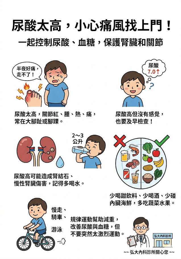 通常是攝取過量高普林食物(如動物內臟、帶殼海鮮、紅肉、火鍋湯底)或高果糖玉米糖漿(常見於手搖飲、甜點)。