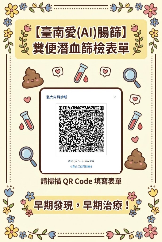 設籍於台南市之市民,不限於新市、善化、新化、安定或永康,持雙證件至本診所掃瞄QR code並完成大腸癌篩檢即可領300元紅包,名額有限(50名)請儘早詢問~