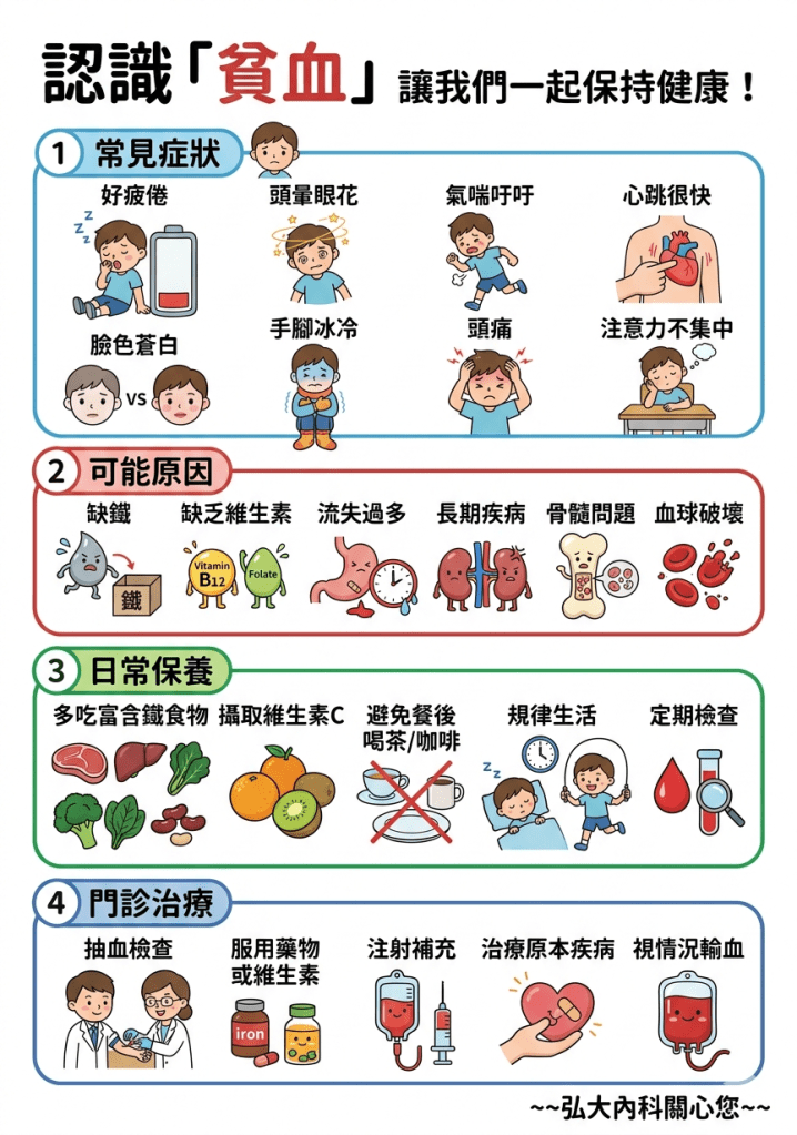 擔心之下,小薇至內科診所就診。醫師詳細詢問飲食和月經史,抽血檢查後,診斷為缺鐵性貧血。原來長期偏食導致鐵質攝取不足,加上每月經血流失,鐵儲備耗盡,紅血球無法正常運氧,才引起這些症狀。小薇這才恍然大悟,開始積極治療。