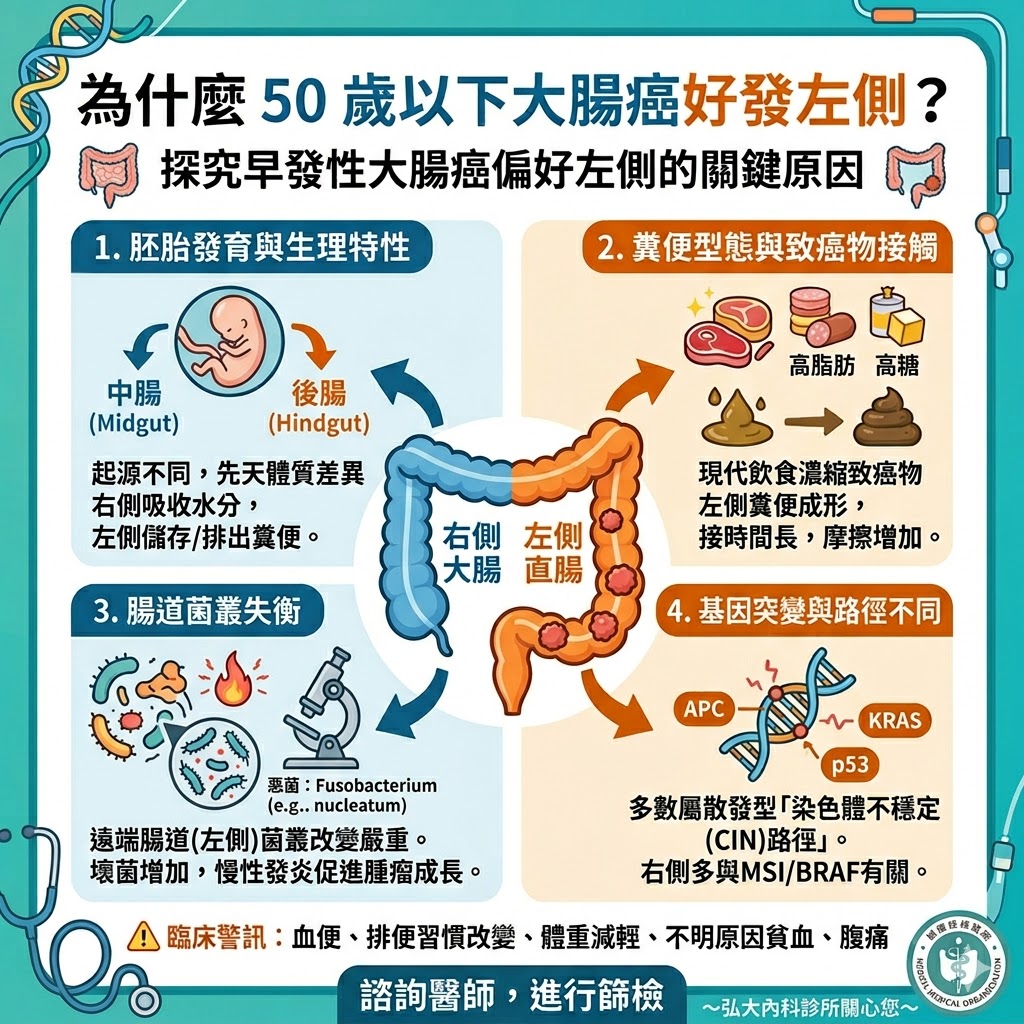 關鍵在於: 現代飲食產生的潛在致癌物質(如亞硝酸鹽、次級膽酸等)在左側腸道中被高度濃縮。加上左側大腸負責「儲存」糞便,導致這些高濃度的致癌物與腸道黏膜接觸、摩擦的時間大幅增加,進而提升了細胞病變與癌化的機率。年輕人若有久坐、便秘的習慣,這個效應會被進一步放大。